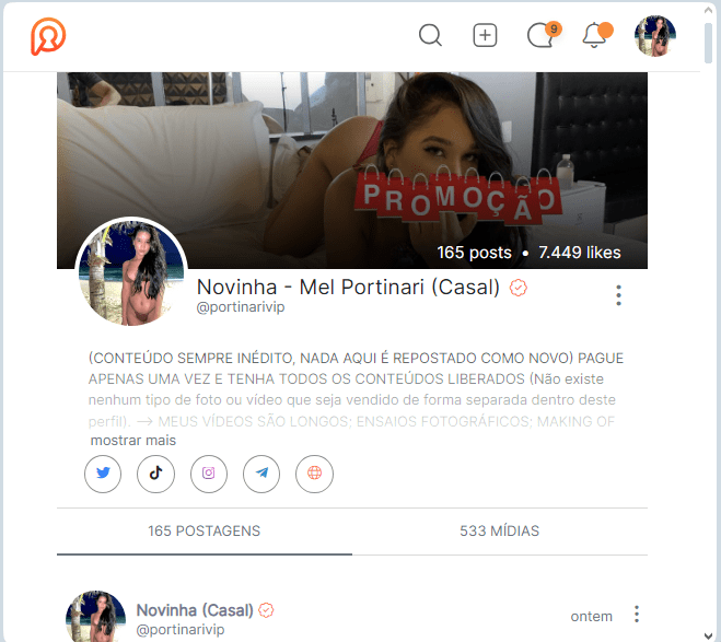 A novinha Mel Portinari trabalha com conteúdos solos ou acompanhada pelo seu marido Brian Ortega, de 41 anos de idade que na verdade foi o grande incentivador de produzirem conteúdos na Privacy, uma plataforma online voltada aos consumidores de material adulto. há cerca um ano quando eles se conheceram em uma boate de Porto Seguro-BA.